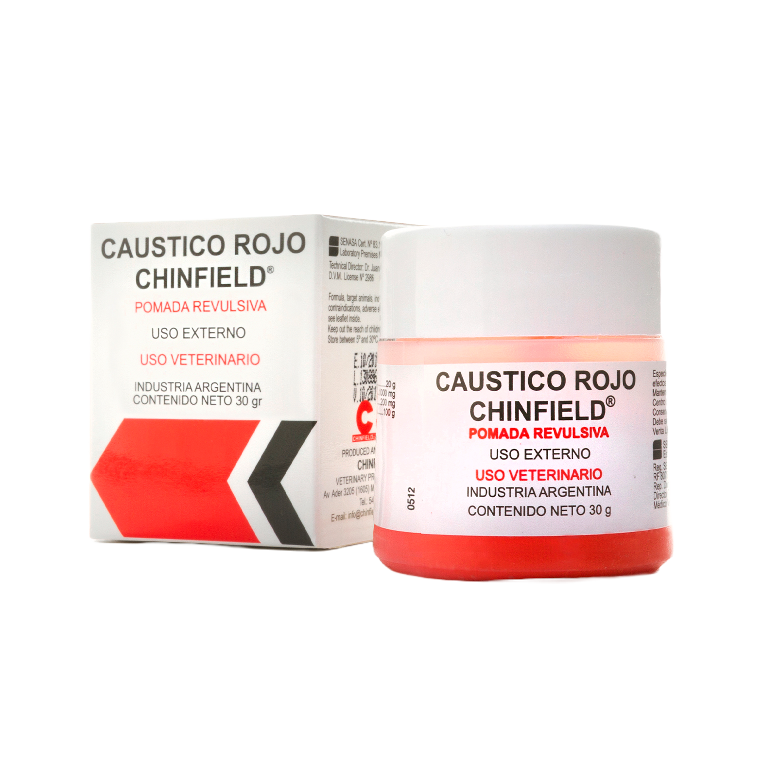 CAUSTICO ROJO CHINFIELD, aplicado sobre la zona afectada, produce un notable flujo de sangre (acción hiperhemiante), con liberación de histamina y sustancias histaminoides y finalmente una proteinoterapia no específica, cuyo resultado es una rápida mejoría del animal y su posterior recuperación total. La absorción lenta y regulada del aceite de crotón y del ácido fórmico, asegura una elevada y constante afluencia de sangre a la región afectada.